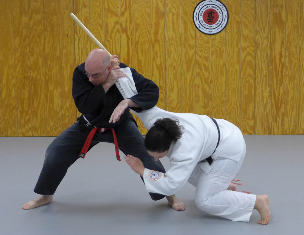With that in mind, we teach defenses against knife, stick and gun attacks. We use a variety of self defense techniques from ALL systems of combat. We begin with the wooden Tanto, and the wood wakizashi which emulates the knife and the machete. Sticks, clubs, baseball bats, and the cane or walking stick are also used to emulate the Katana, Ken, Tanjo, Bo, or To.
